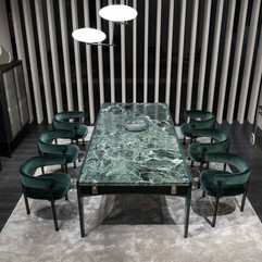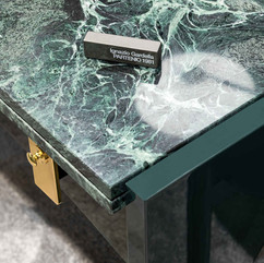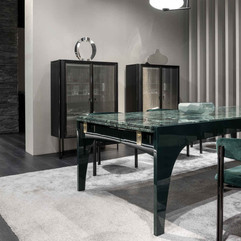 It stands out for the sophisticated combination of lacquered surfaces and marble inserts, embodying a refined and timeless aesthetic.